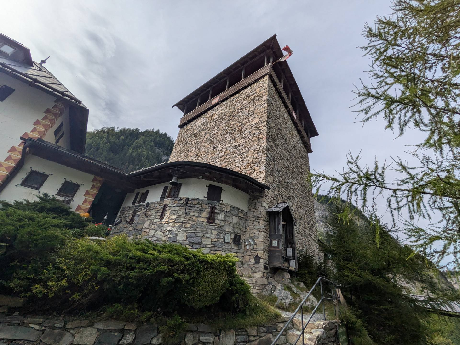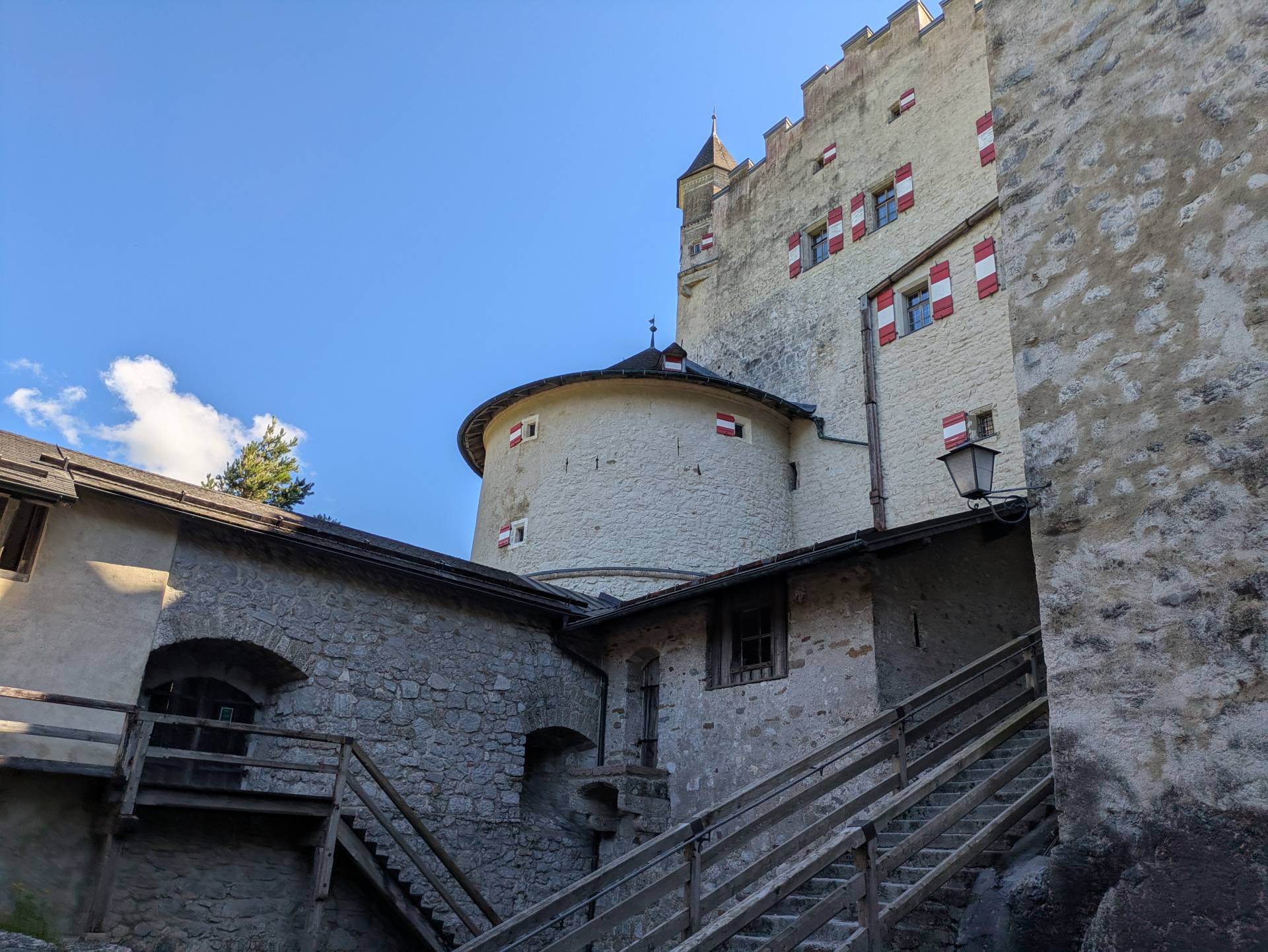 - Een torentje en een trap van Burg Hohenwerfen